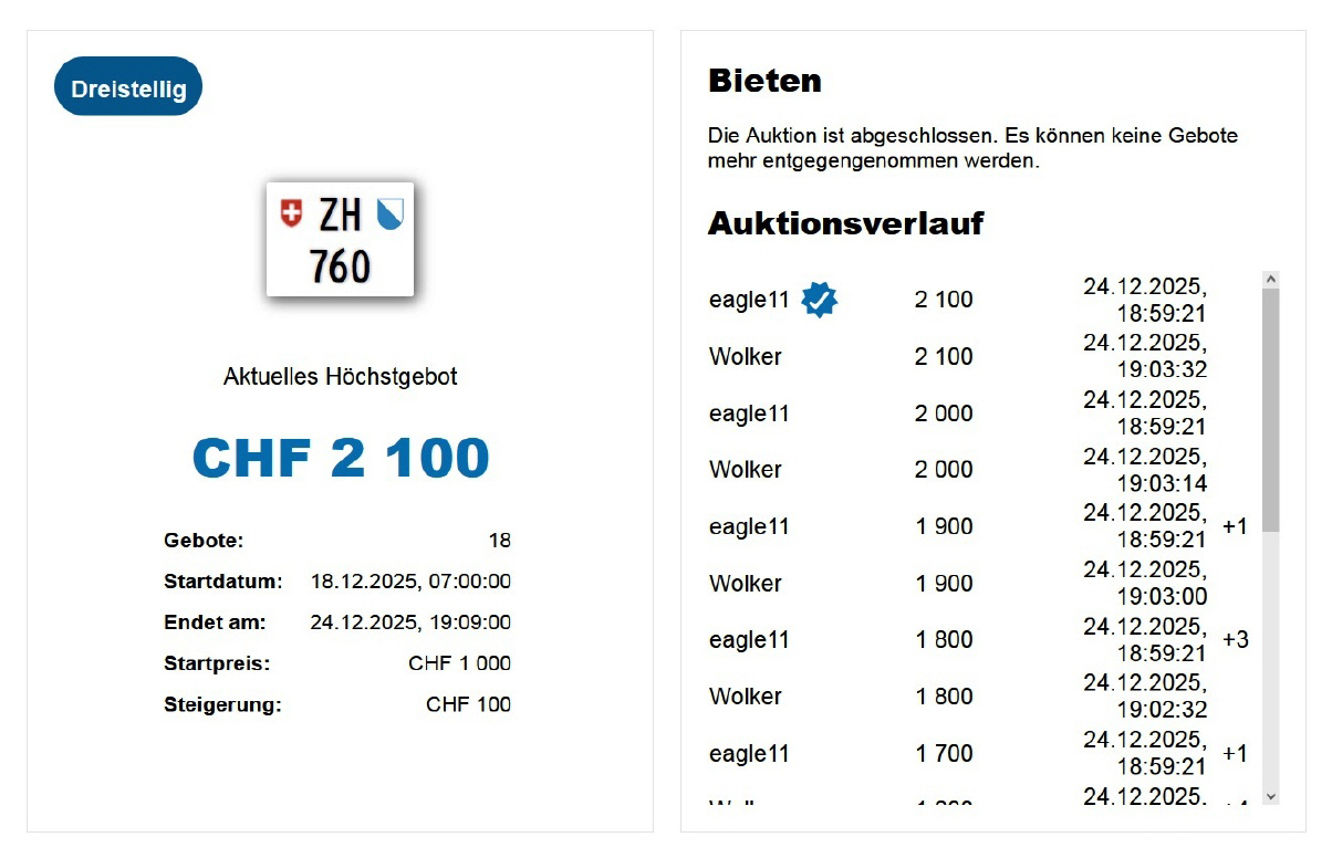 Am 24.12.2025 wurde im Kanton Zürich das nächste 3-stellige TÖFF-Nummernschild ausgegeben - in der Auktion ging es zum relativ guten Preis von Fr. 2100.- weg! Verfolge den Verlauf vom «ZH 760