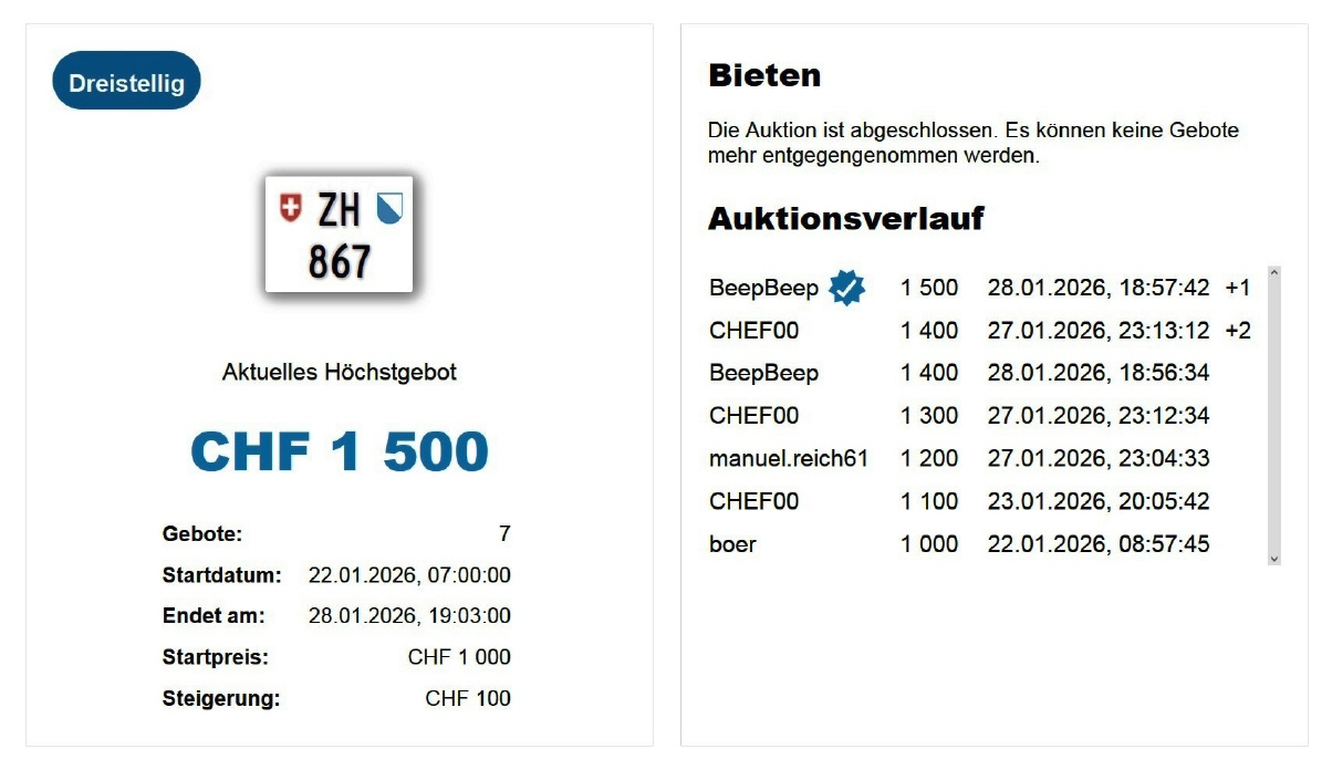 Am 25.11.2020 wurde im Kanton Zürich das 3-stellige TÖFF-Nummernschild ausgegeben - in der Auktion ging es für Fr. 4000.- weg: Auch hier boten sich zwei Bieter hoch! Verfolge den Verlauf vom «ZH 701