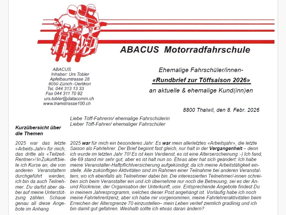 Dieses E-Mail ging ENDLICH am Sonntag, 8.Febr. 2026 raus. Eigentlich hätte es schon am 5.Febr. abgesandt werden sollen, aber inzwischen konnte ich für die «MotoZürich» noch eine Verbilligung von 20% organisieren auf Online-Tickets, die vor dem 12.Febr. gelöst werden! Also nicht zögern, zupacken!